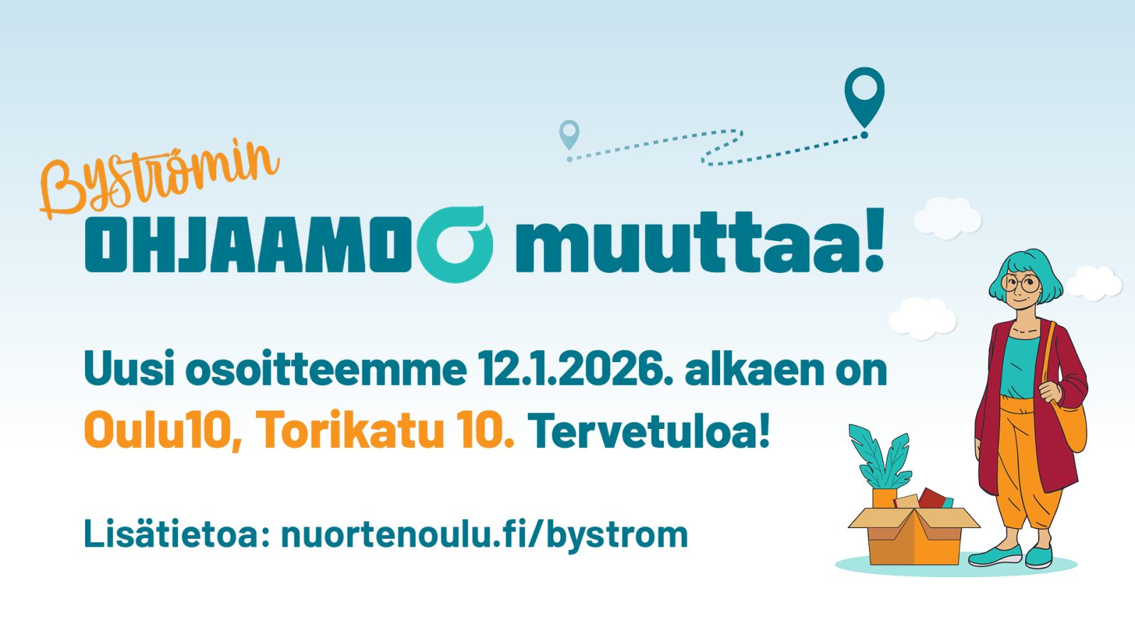 Byströmin Ohjaamo muuttaa uusiin tiloihin Oulu10:iin. Ohjaamo on kokonaan suljettu 1.-11.1.2026 ja avaamme uudessa osoitteessa maanantaina 12.1.2026 klo 9. Oulu10 ja Byströmin Ohjaamo sijaitsevat osoitteessa Torikatu 10.